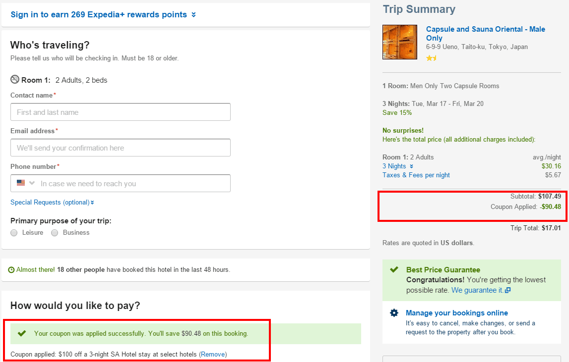 只要訂單金額超過折扣代碼既金額就可以用到,訂一些平酒店既話,差不多等於免費入住,勁抵!