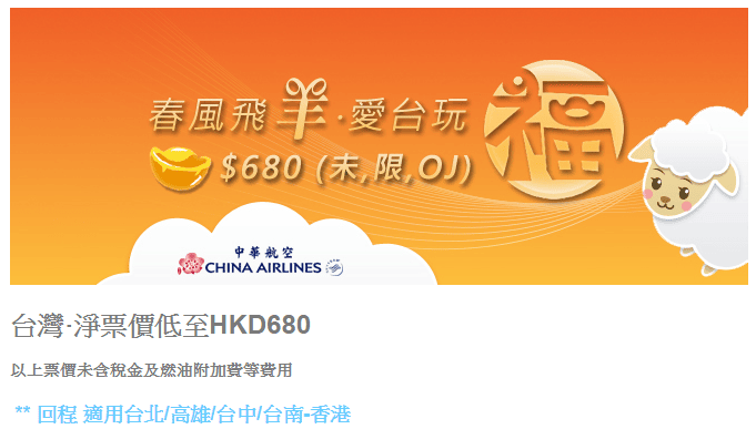 5月31日前出發!香港往返台北、高雄、台中、台南只需$680起 (可open jaw) – 中華航空 (優惠至3月1日)