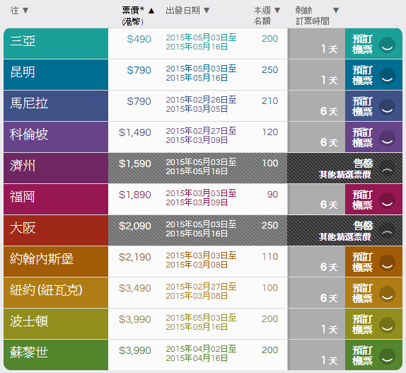 (三亞$490 連稅$885)、(馬尼拉$790 連稅$1,171)、(昆明$790 連稅$1,185)、(科倫坡$1,490 連稅$2,517)、(濟州$1,590 連稅$2,041)、(福岡$1,890 連稅$2,237)、(大阪$2,090 連稅$2,575)、(約翰內斯堡$2,190 連稅$3,415)、(紐約$3,490 連稅$4,814)、(蘇黎世$3,990 連稅$5,128)、(波士頓$3,990 連稅$5,378)