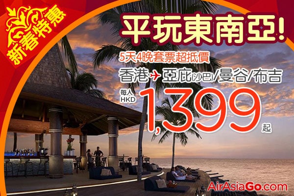 AirAsiaGO抵玩套票!曼谷、布吉、清邁、沙巴、吉隆坡5日4夜套票連稅只需$1,399起 (優惠至3月8日)