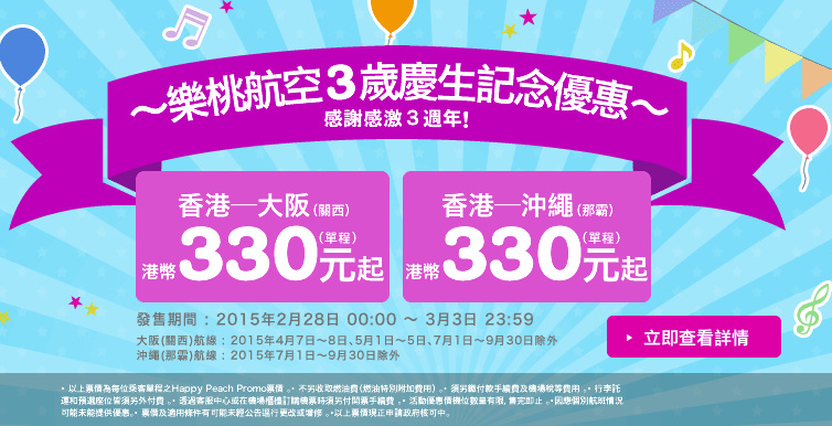 另外日本樂桃會係聽晚11點(2月28日11pm)推出全部國內線2,000円、國際線3,000円優惠 (詳情:http://www.flypeach.com/campaign/thirdbirthday_sale_20150301.aspx)