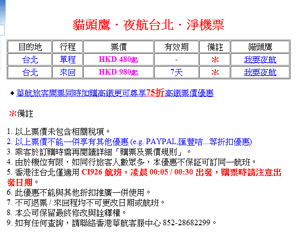 中華航空推出了”貓頭鷹.夜航台北.淨機票”的新優惠,夜航台北只需$480 起,來回只需$980 起