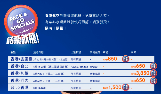 香港往返台北$650,連稅$929;河內$650,連稅$1,061;札幌$3,850起,連稅$4,123;價錢都唔錯