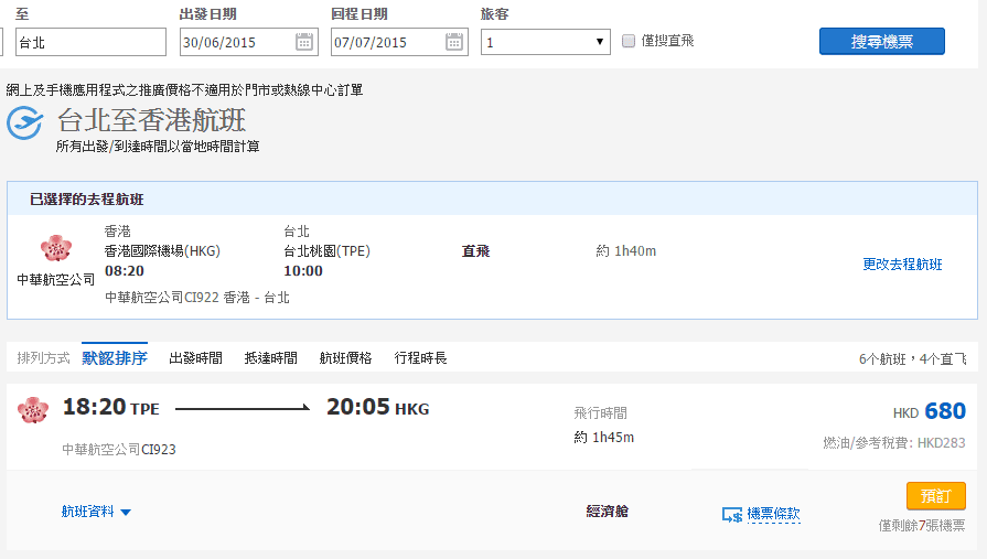 經我們測試,以台北6月30日出發,7月7日返回為例
