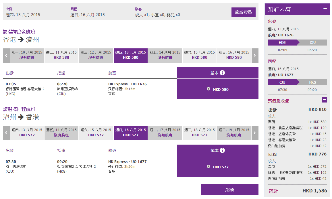 回程:UO1677 07:30-09:20 (二、四、六、日)