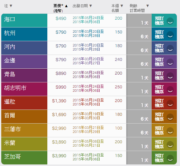 而杭州、河內、金邊、首爾、三藩市係介乎3月19日至3月30日指定日子來回