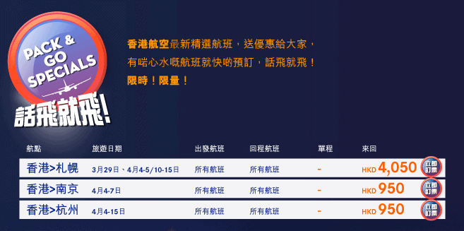 復活節未諗到去邊,睇下今晚12點香港航空新一期”話飛就飛”岩唔岩心水!