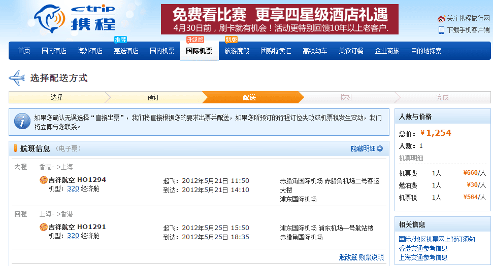 去程:HO1294 11:50 HO1292 19:35