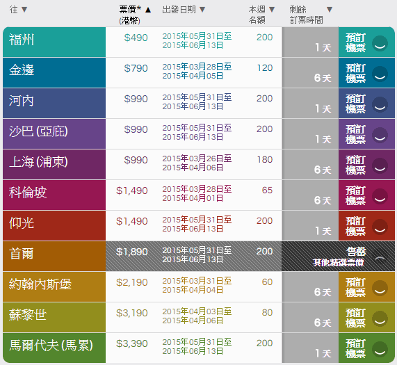 (福州$490 連稅$807)、(金邊$790 連稅$1,189)、(上海$990 連稅$1,307)、(沙巴$990 連稅$1,332)、(河內$990 連稅$1,401)、(仰光$1,490 連稅$1,863)、(可倫坡$1,490 連稅$2,179)、(首爾$1,890 連稅$2,293)、(約翰尼斯堡$2,190 連稅$3,053)、(蘇黎世$3,190 連稅$3,969)、(馬爾代夫$3,390 連稅$4,079)