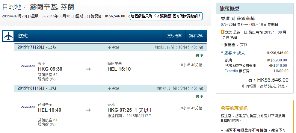 另外直飛赫爾辛基$5,930,連稅$6,546