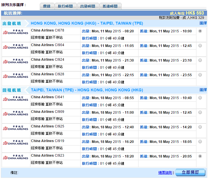 經我們測試,以台北5月11日出發,5月18日返回為例