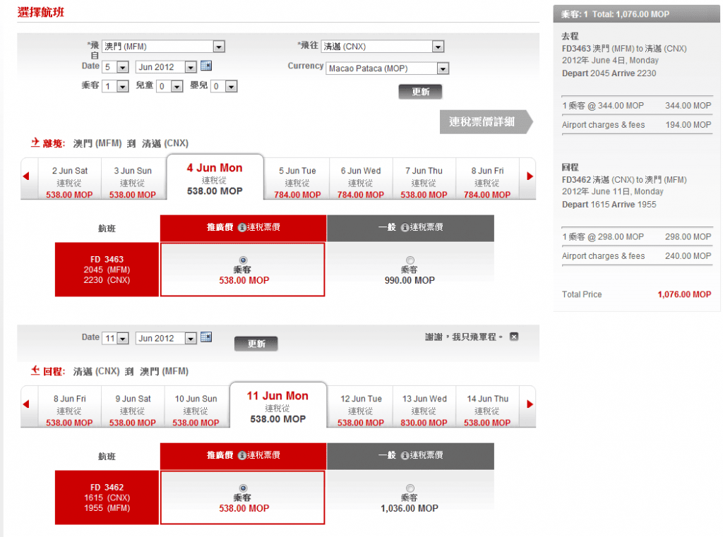 澳門直飛泰國清邁單程連稅只需港幣$549起,來回連稅澳門幣1076 (約港幣$1,050)