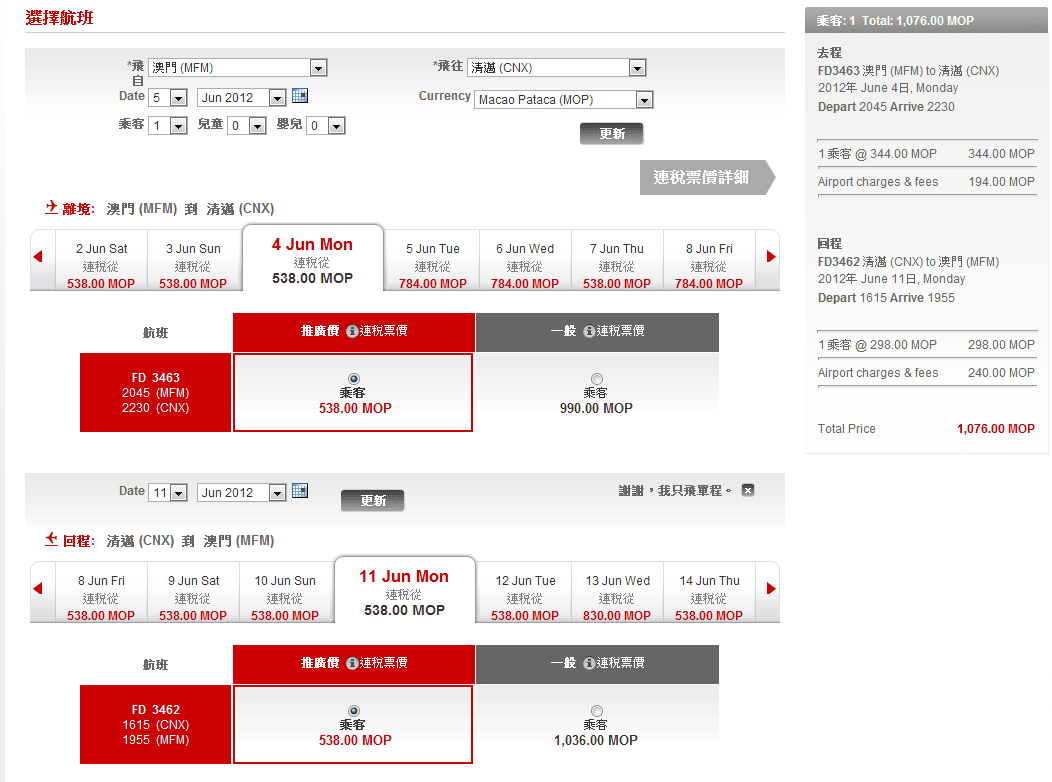 澳門直飛泰國清邁單程連稅只需港幣$549起,來回連稅澳門幣1076 (約港幣$1,050)