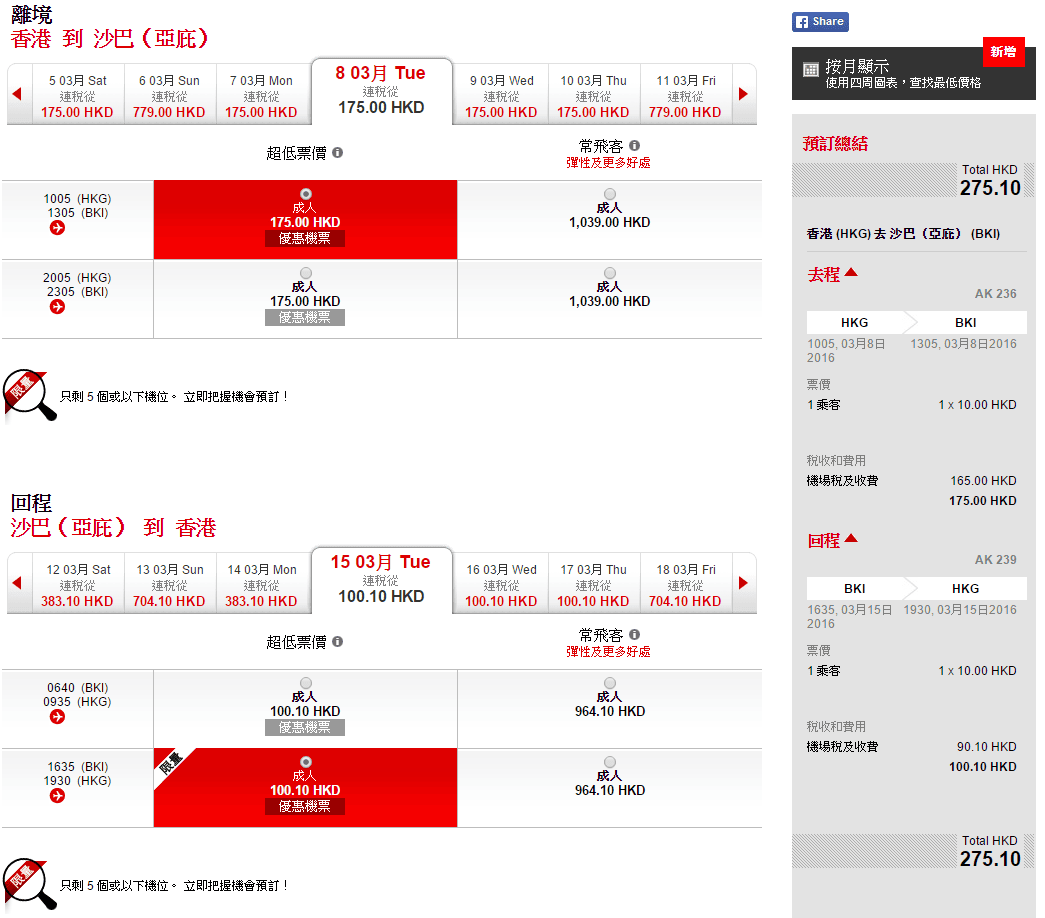 香港飛沙巴單程只需$10,來回連稅$275,勁抵!仲平過Big Sale!