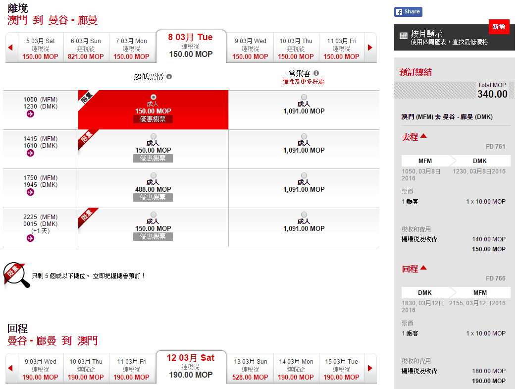 澳門飛曼谷、吉隆坡單程只需MOP10,來回連稅吉隆坡MOP263、曼谷MOP340,勁抵!