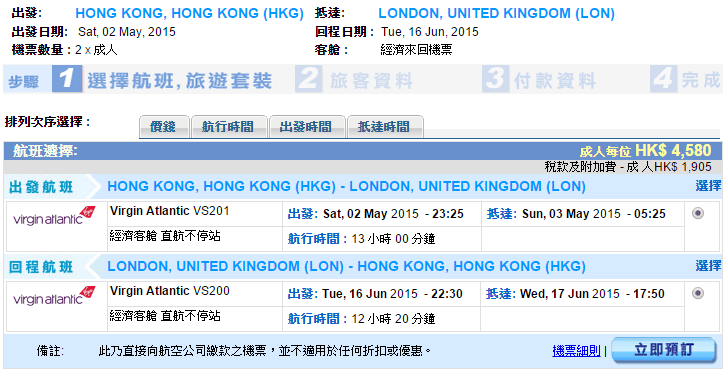 香港直航往返倫敦只需$4,580,連稅$6,485,經Priceline/ZUJI訂可以平多$200