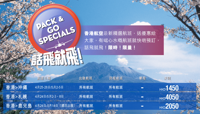 香港往返沖繩$1,450,連稅$1,731;鹿兒島$2,050,連稅$2,266;札幌$4,050,連稅$4,333,價錢都可以