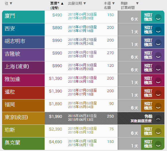 (廈門$490 連稅$821)、(西安$890 連稅$1221)、(上海$990 連稅$1,321)、(吉隆坡$990 連稅$1,355)、(胡志明市$990 連稅$1,373)、(雅加達$1390 連稅$1,696)、(暹粒$1,390 連稅$1,800)、(福岡$1,890 連稅$2,169)、(東京$1,990 連稅$2,376)、(珀斯$2,390 連稅$3,496)、(奧克蘭$4,690 連稅$5,535)