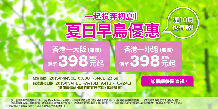 大阪$398適用於6月1日至7月16日出發(去程坐MM64)