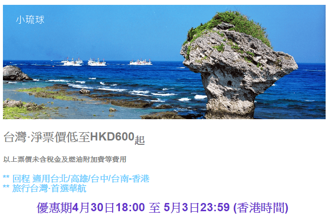 香港往返高雄、台南只需$600,連稅$938;台北/台中$680,連稅$1,018