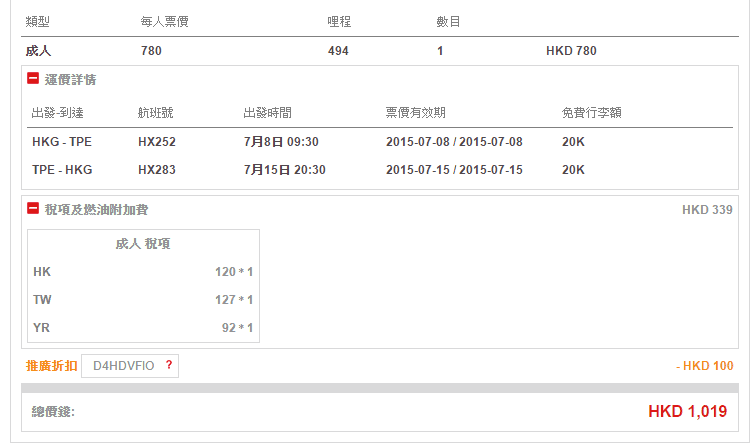 香港往返台北$780,星期六日周末熱價減$100後,只需$680,連稅$1,019
