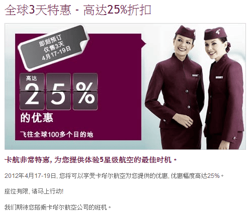 優惠只限三天 – 卡塔爾航空全球3天特惠 七五折優惠 – 卡塔爾航空 Qatar Airways (優惠至4月19日)