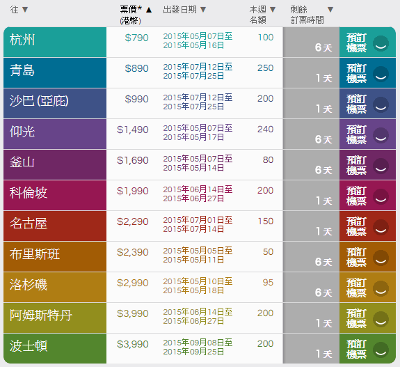 而杭州、仰光、釜山、布里斯班、洛杉磯係介乎5月7日至5月18日指定日子來回