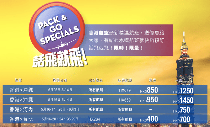 開賣啦!香港往返台北$700,河內$750,沖繩$1,250起 – 香港航空 (優惠至5月8日)