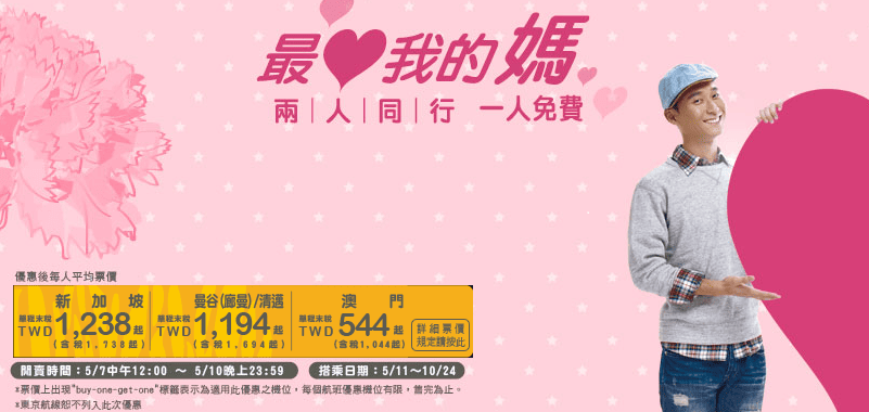 澳門Fans留意啦!台灣虎航會係中午12點推出母親節買一送一優惠!