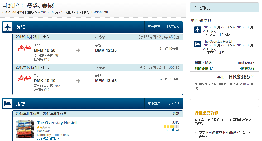 抵呀!訂套票,澳門飛曼谷機票$0!3日2夜套票連稅只需$365起 – Expedia HK (優惠至5月10日)