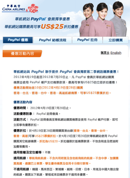 即日起至2012年7月20日,凡 PayPal 用戶於中華航空網站 購買機票並使用 PayPal 帳戶支付款項,即可享有立即接扣優惠!
