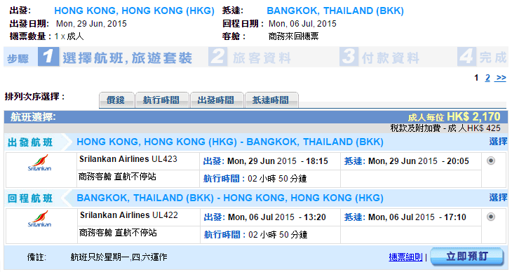 斯里蘭卡航空香港往返曼谷航缐只係逢星期一、四、六營運