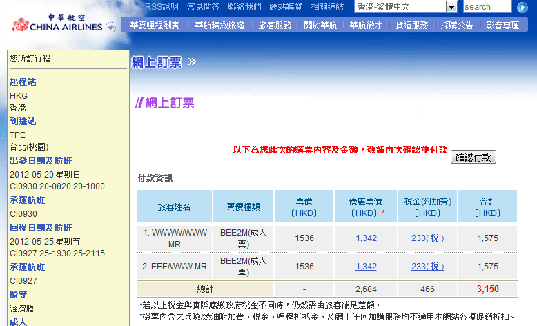 大家可以去中華航空官網出飛,記住人數要揀2-4人先見到個優惠價