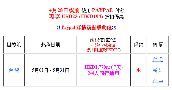 台北、台中都有優惠呀!香港往返台北、台中二人同行每位只需 $1,040,配合 PayPal  網路購票優惠減 $194即係機票只需 $846,連埋稅 $1,575,呢個價真係超值