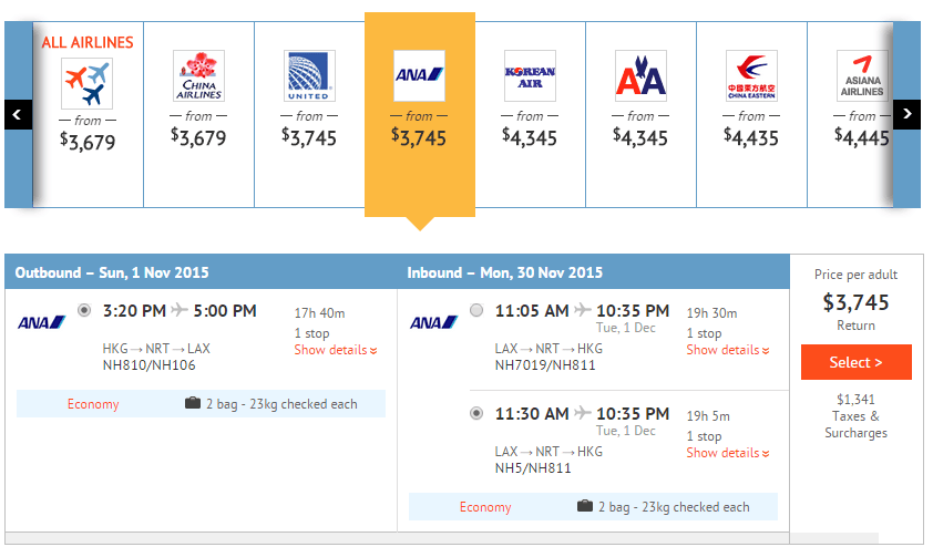 機票只需$3,745 + $1,341 (稅) = 機票連稅$5,086