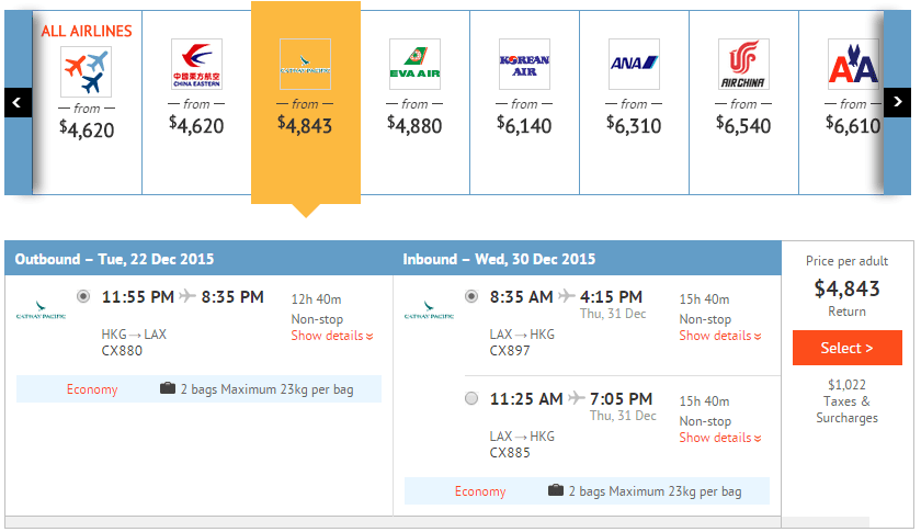 經我們測試,以洛杉磯12月22日出發,12月30日返回為例