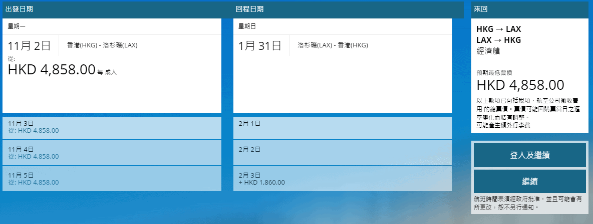 經我們測試,以洛杉磯11月2日出發,1月31日返回為例