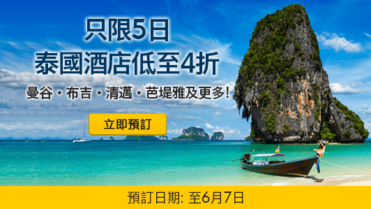 限時5天!泰國酒店低至4折優惠 – Expedia HK (優惠至6月7日)