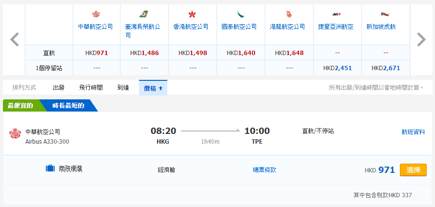 香港往返台北、高雄、台中、台南只需$634起,連稅$971起,價錢好吸引