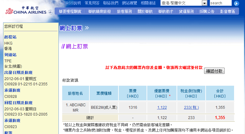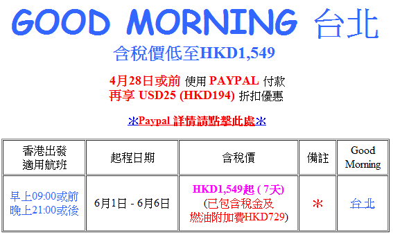 6月1至6月6日坐09:00之前或21:00之後既航班出發去台北,香港往返台北只需 $820, 配合 PayPal  網路購票優惠減 $194即係機票只需 $626,連埋稅 $1,355,呢個價算係近期至抵價