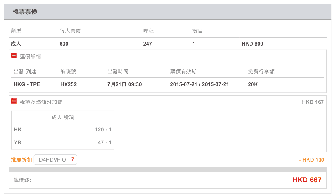 香港飛台北單程只需$500,連稅$667;曼谷$550,連稅$717;沖繩$1,300,連稅$1,467