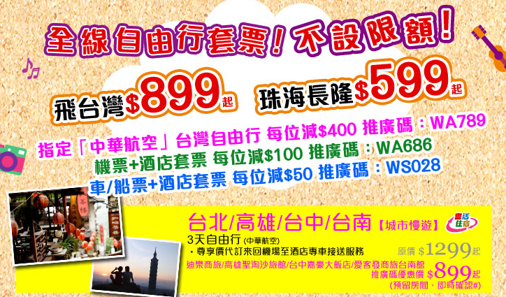 台北、高雄、台中、台南3日2夜自由行套票只需$899起,連稅$1,324起,都幾抵下