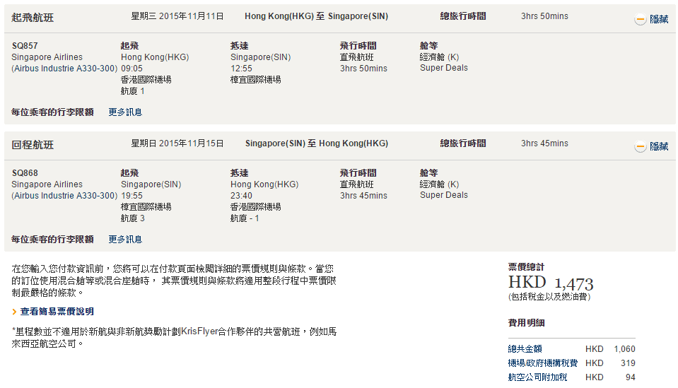 香港往返新加坡只需$1,060,連稅$1,473,價錢都唔錯