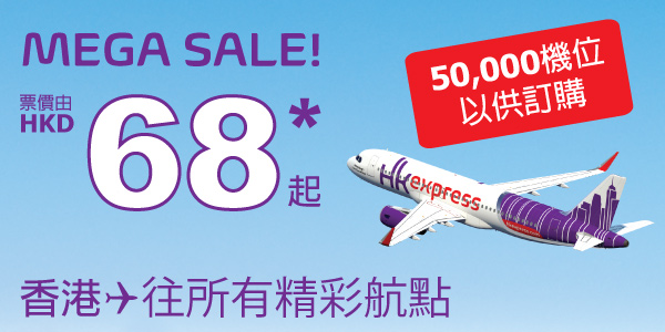 嘩!全線$68!開搶啦!Mega Sale!所有航點單程只需$68 – HK Express (優惠至6月29日)