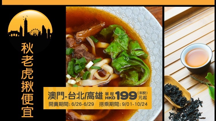 10月24日前出發!澳門往返台北、高雄來回連稅只需$778 – 台灣虎航 (優惠至6月29日)