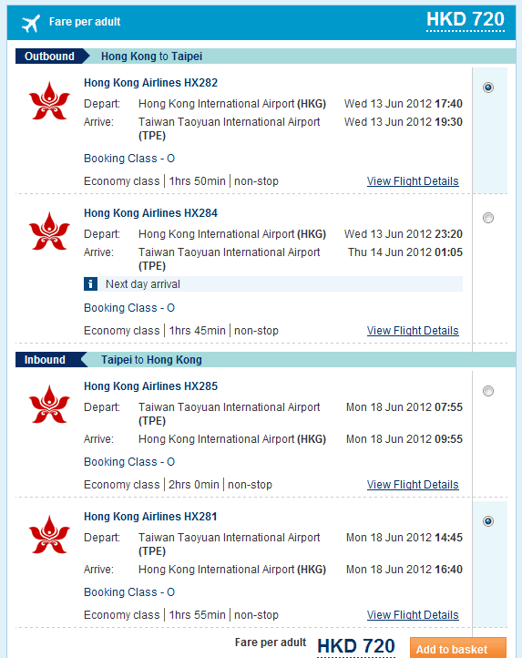 不過台北既優惠要晚機去,台北去程限坐 HX282 17:40-19:30 或 HX284 23:20-01:05 ,回程無限制