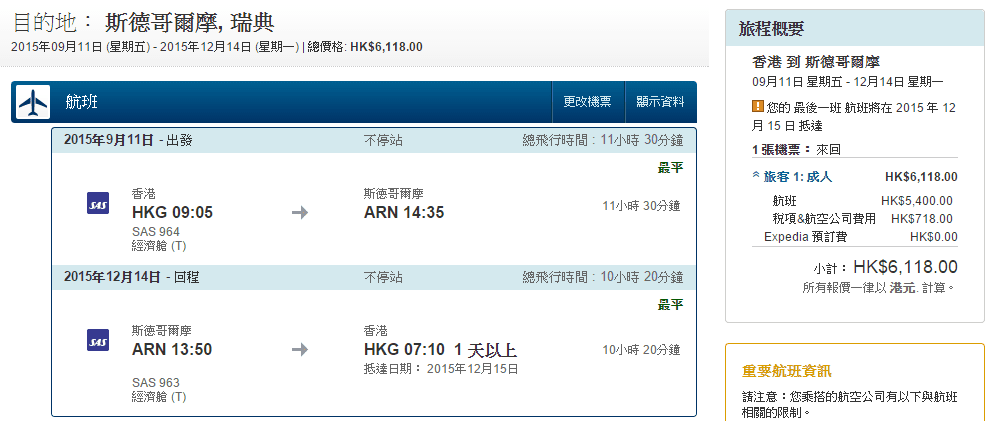 大家可以上Expedia HK / 北歐航空官網訂票