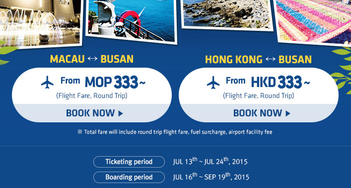 澳門出發都有優惠,澳門飛釜山來回MOP333,連稅MOP1,150