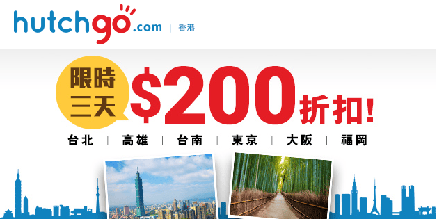 Hutchgo HK (之前叫Priceline HK) 又有限時3日台灣/日本機票減$100,套票減$200優惠