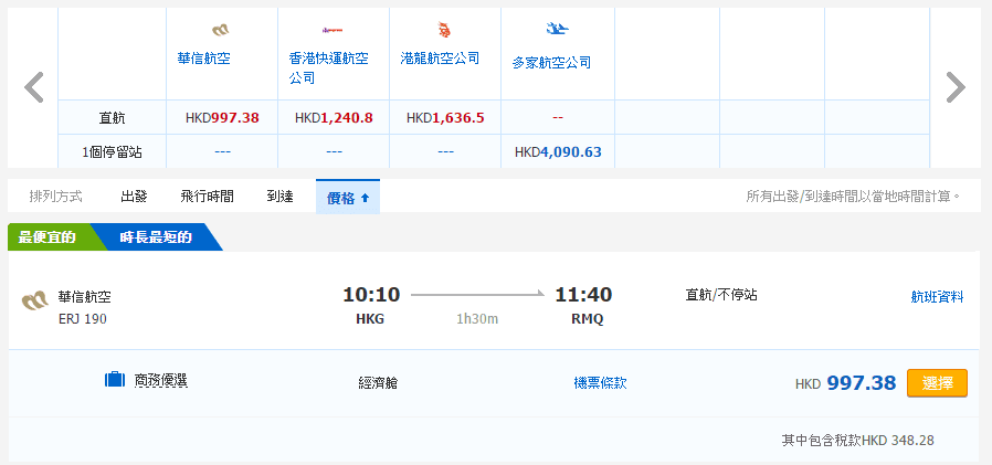 香港往返台中只需$649,連稅$997;台北、高雄、台南$712,連稅$1,055